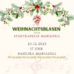 Die Stadtkapelle Mariazell hat sich in diesem Jahr 24 Tage lang, vom 1. bis zum 24. Dezember 2023 in Form eines Adventskalenders auf den Social Media Plattformen Facebook und Instagram vorgestellt. Wir freuen uns sehr, dass unser Adventkalender großen Gefallen gefunden hat und bedanken und für die zahlreichen Likes und Kommentare.